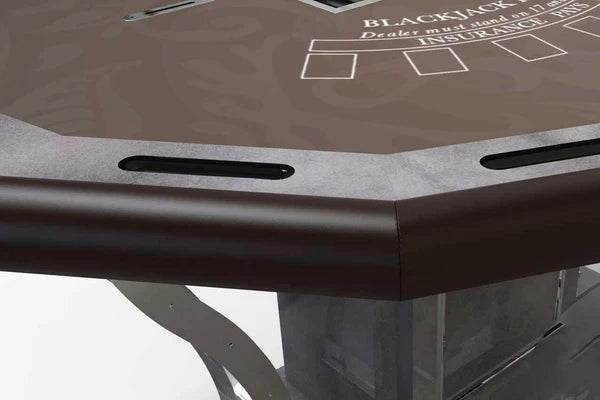 The Pantheon Blackjack Table combines a rich brown finish with a sleek gray racetrack, exuding sophistication and modern appeal. Designed with premium accessories and a futuristic base, this customizable table delivers a top tier casino experience.