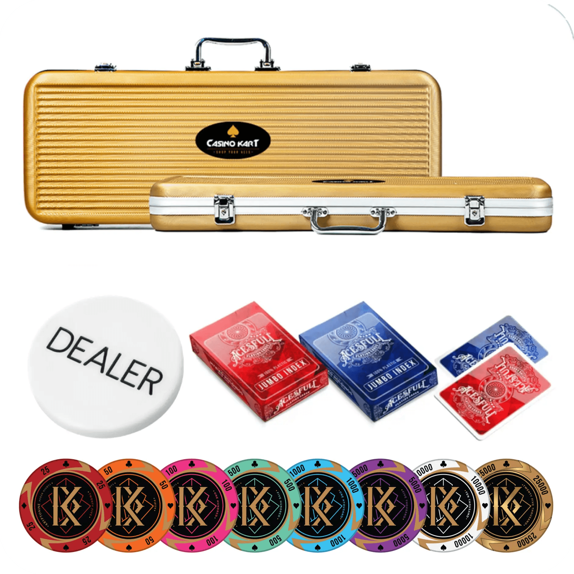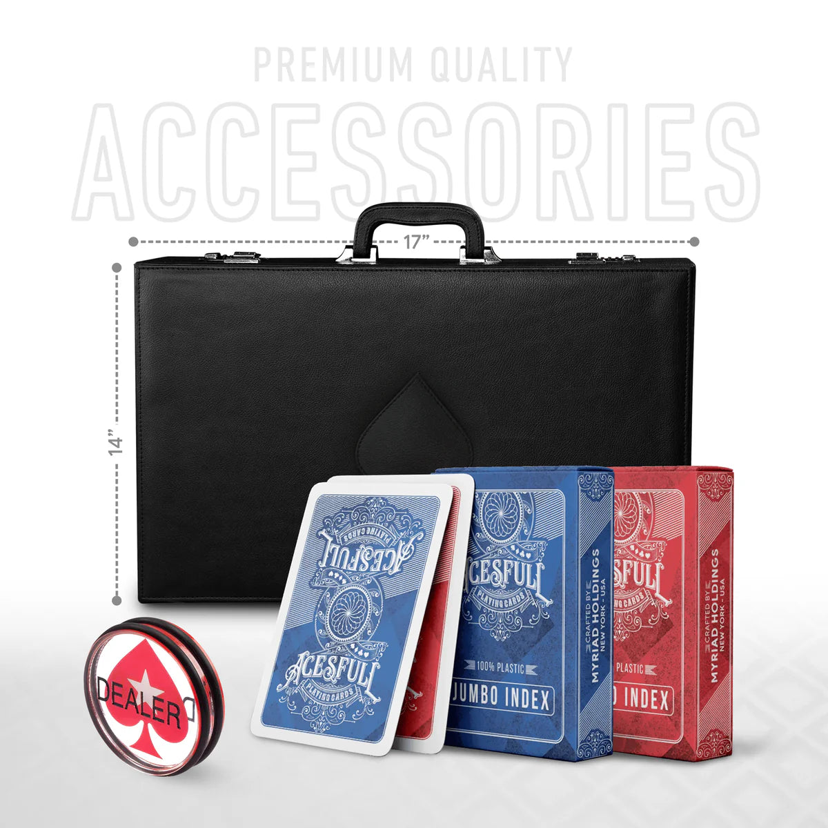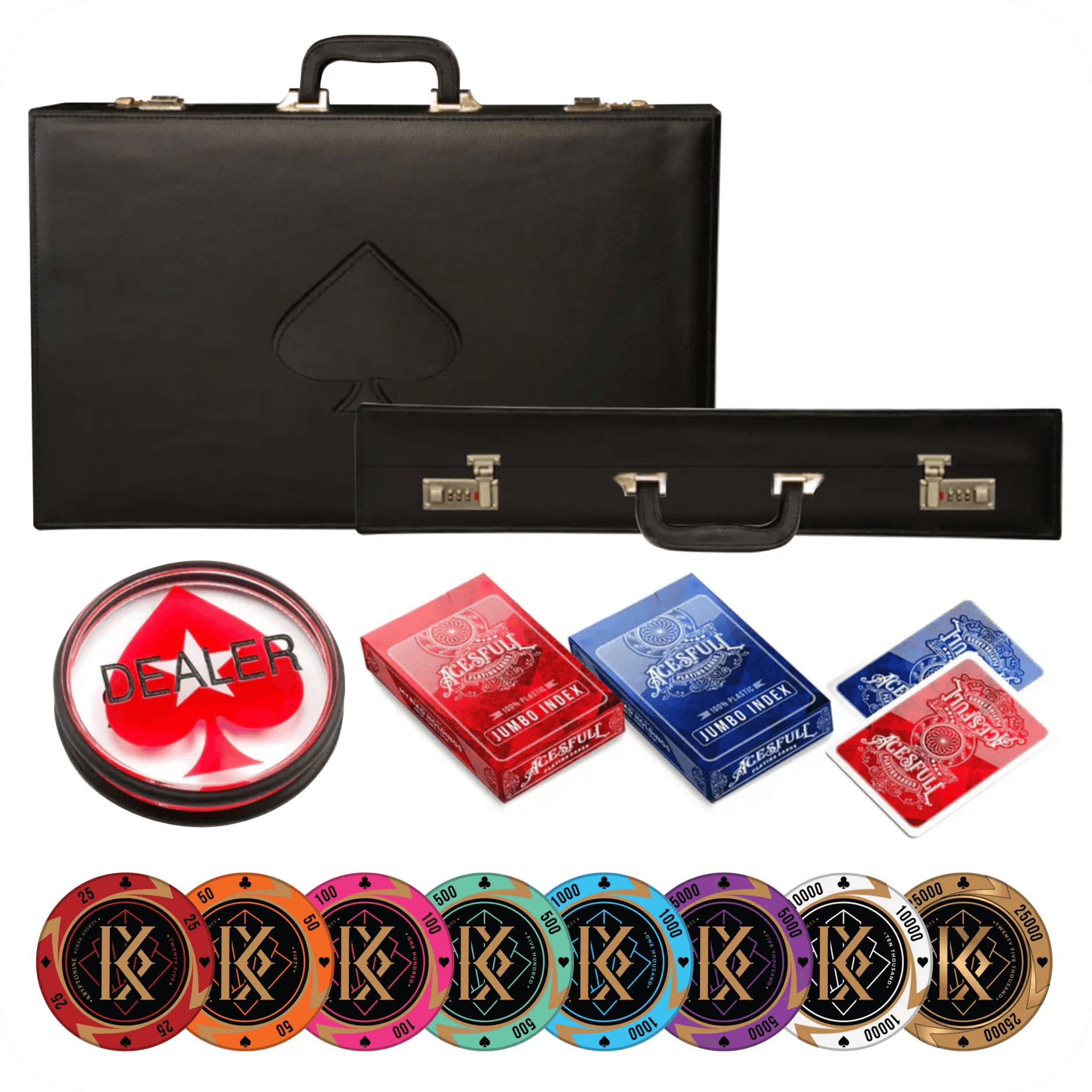 With up to 20 plaques included in the larger sets, along with quality accessories like Acesfull playing cards, a dealer button, and a premium case (choice depends on chip size), this set is ready to command attention. Optional premium poker table mats are also available to elevate your table’s aesthetics and functionality.