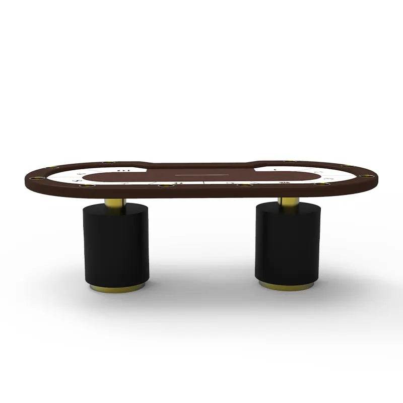 The German Grenade Poker Table is an exquisite blend of power, luxury, and superior craftsmanship. Designed for elite poker players, this 8 by 4 ft poker table embodies resilience and sophistication with its oval-shaped tabletop, robust cylindrical dual-leg base, and golden accents. Whether you prefer brown, white, red, or black, this table can be tailored to match your gaming aesthetic, making it an impeccable choice for home poker rooms, private lounges, and high-stakes tournaments.