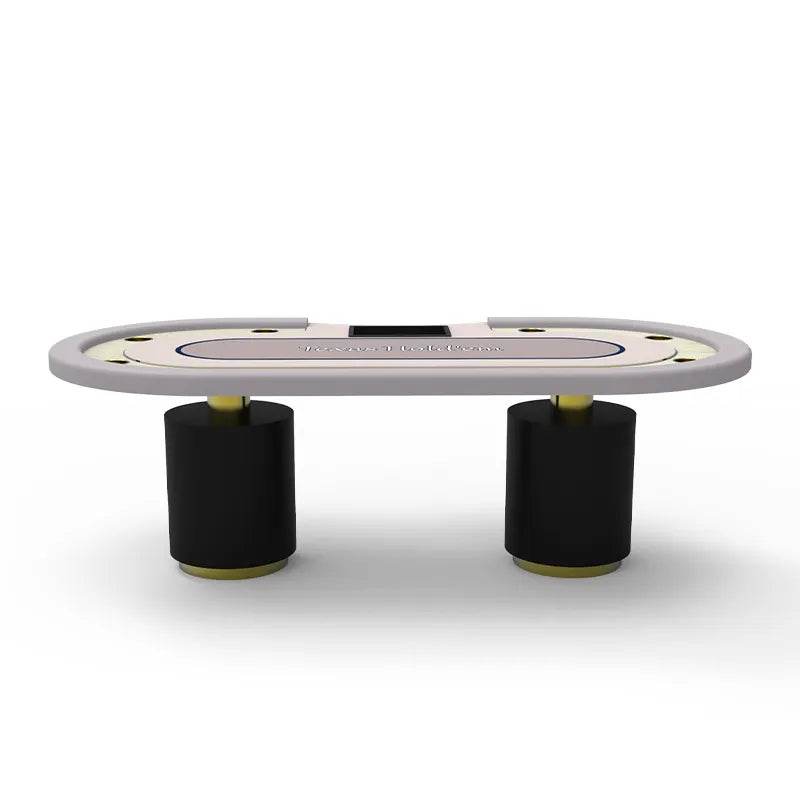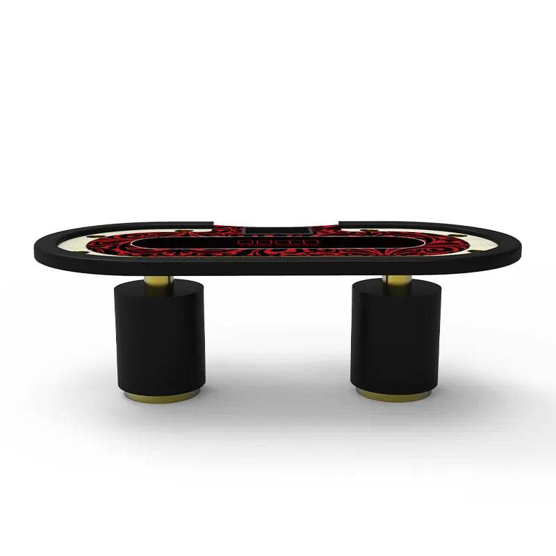 The German Grenade Poker Table stands out with its sleek oval tabletop, providing a spacious and comfortable playing surface. Its dual cylindrical black legs, reinforced with a golden rod and strips, offer unparalleled stability and a refined aesthetic, ensuring it remains the centerpiece of any gaming setup.