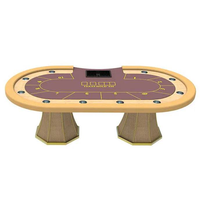 Built with both durability and design in mind, the dual octagon shaped pillar base offers exceptional stability and visual appeal. The yellowish bottom and refined strips on the pillars add a touch of grandeur, ensuring that the table is as stylish as it is robust. Designed to withstand intense gameplay, this base provides rock solid support for years of thrilling poker nights.